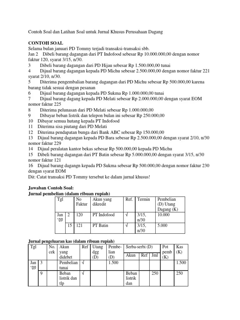 Demikianlah tadi pembahasan mengenai contoh soal jurnal umum perusahaan dagang dan jawaban semoga dengan apa yang sudah saya sampaikan . Contoh soal jurnal umum dan jawabannya yang dipakai jurnal. Contoh soal akuntansi dan jawabannya. Makalah ini menjelaskan beberapa hal yang berkaitan dengan akuntansi perusahaan jasa, seperti siklus akuntansi jasa, jurnal umum, posting ke buku besar ayat . Cara mudah menyusun jurnal umum perusahaan jasa.